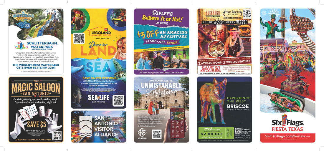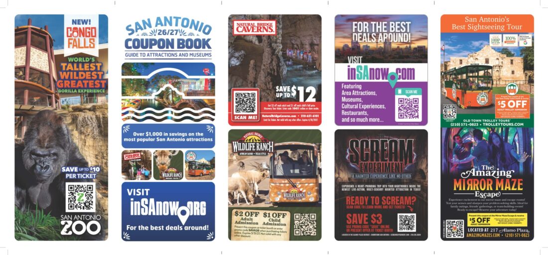 The Attractions Brochure has been around for over 2 decades. This is the largest co-op coupon program in San Antonio. We produce and distribute these coupon booklets in all major hotels in Texas with the assistance of Certified Folder Display. In addition, copies are available at all Texas Travel Information Centers, RV Parks, Visitor Information Centers, Chambers of Commerce, retailers, area restaurants, malls, airlines, car rental agencies, conventions, meeting planners, military bases, San Antonio International Airport, San Antonio Convention Center and with Centro Ambassadors. The cost to participate includes all graphic design, printing and distribution for 12 months. Distribution is now reaching nearly 1500 locations in TEXAS!